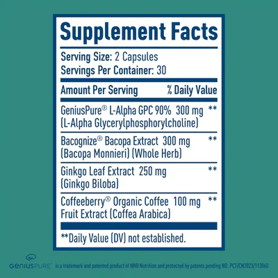 INGREDIENTS: Bacognize® Bacopa monnieri, GeniusPure® Alpha GPC 90%, Ginkgo Biloba Leaf 4:1 Extract, CoffeeBerry® Soluble Coffee Fruit Extract