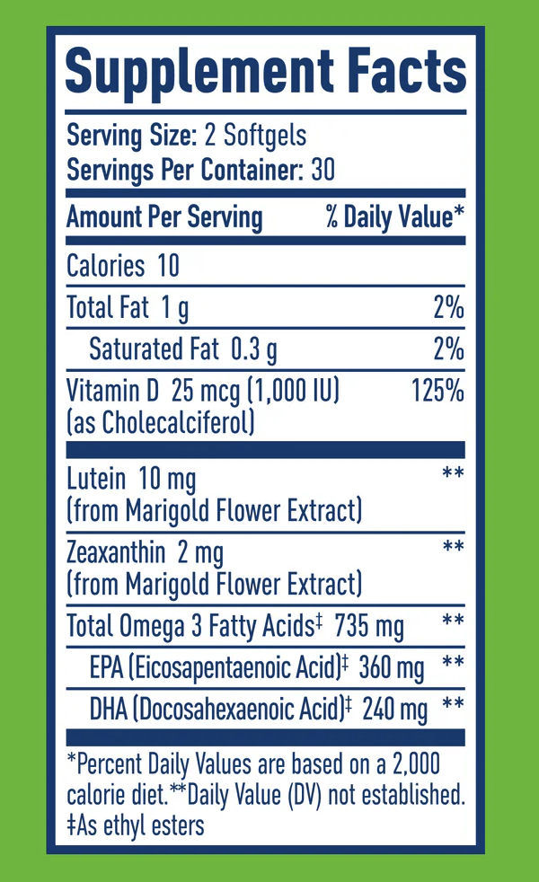 INGREDIENTS: Lutein (from Marigold Flower Extract), Zeaxanthin (from Marigold Flower Extract), Vitamin D (as Cholecalciferol), EPA, DHA